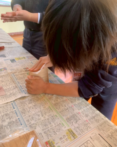 四角い木をペーパーやすりで磨き、使い方は自由。コースターに仕上げたい子が多く、角をなめらかにするために時間いっぱい黙々と集中する姿がとても印象的でした。「時間が足りない…」そんな声が聞こえてくるほど🍀